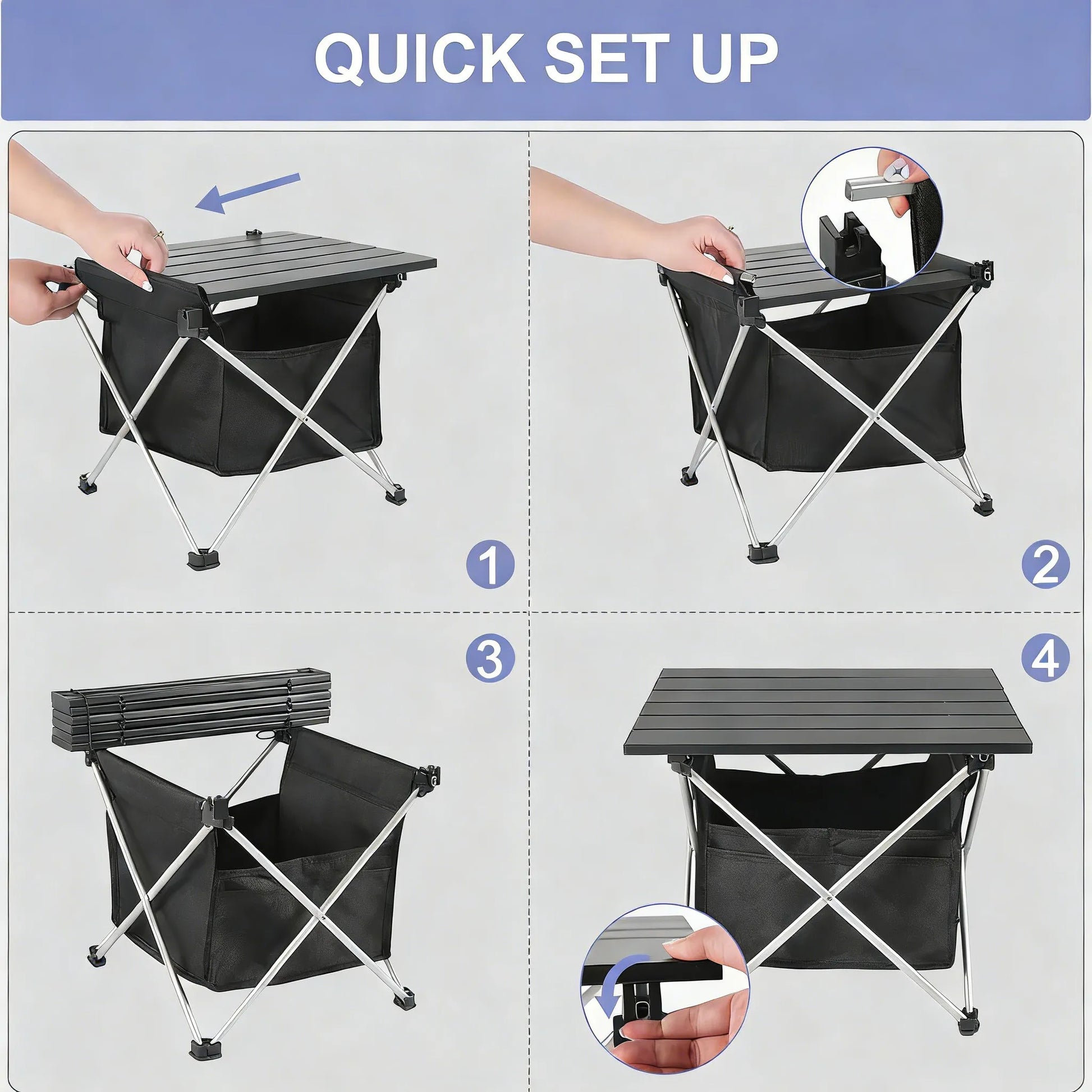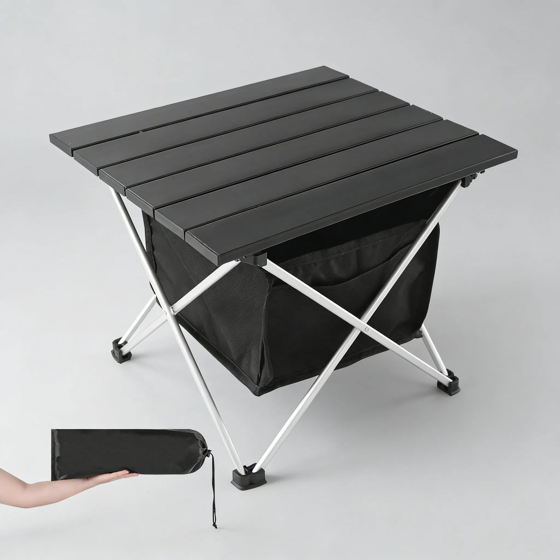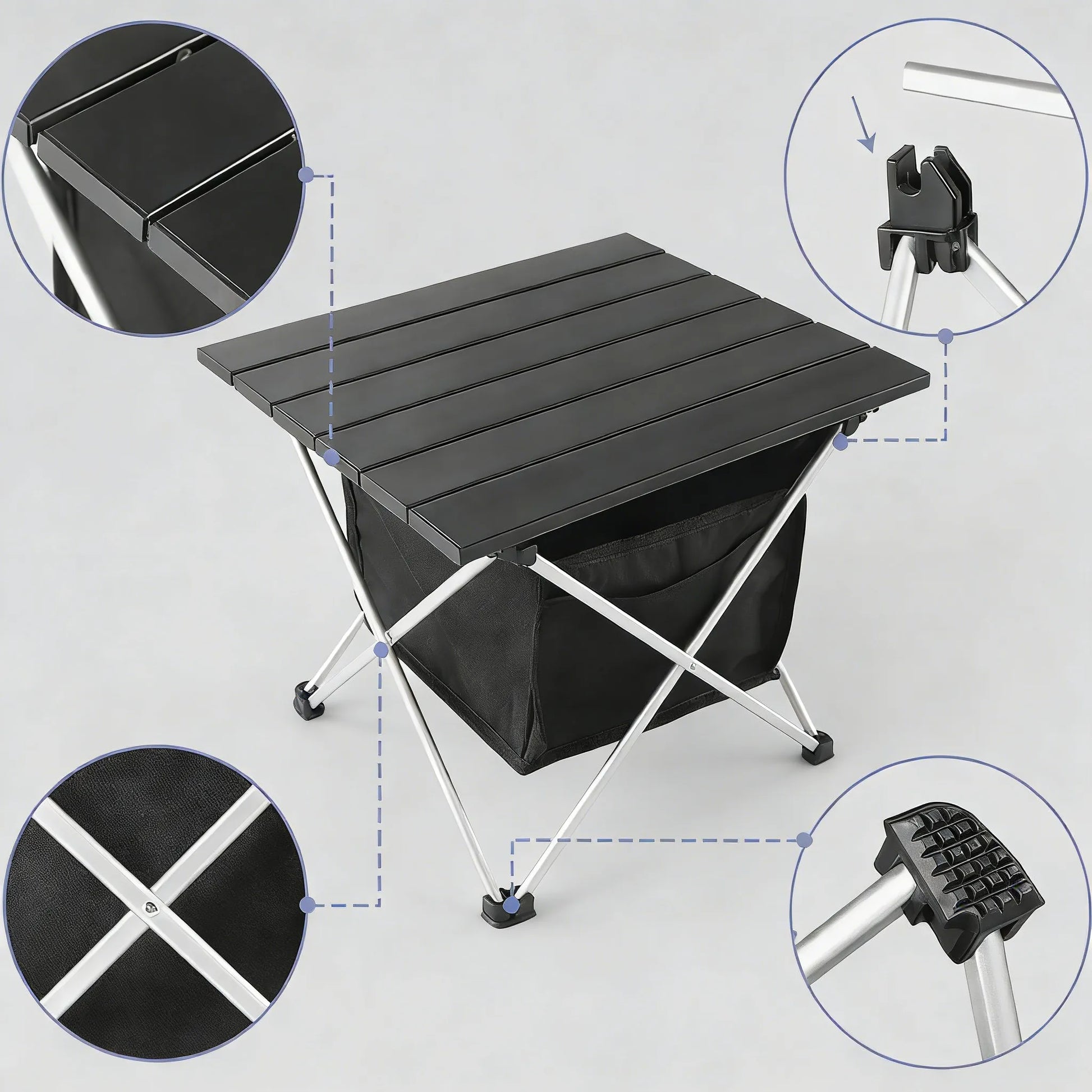 Ultralight & Portable – The aluminum top and frame make it lighter than similar-sized wooden tables. Weights are Small: 1.85 lbs, Medium: 2.6 lbs, Large: 3.3 lbs. It folds compactly into the included carry bag for easy storage in a backpack or trunk—great for campers, beach trips, or as a stable surface on a tent mat or beach towel.